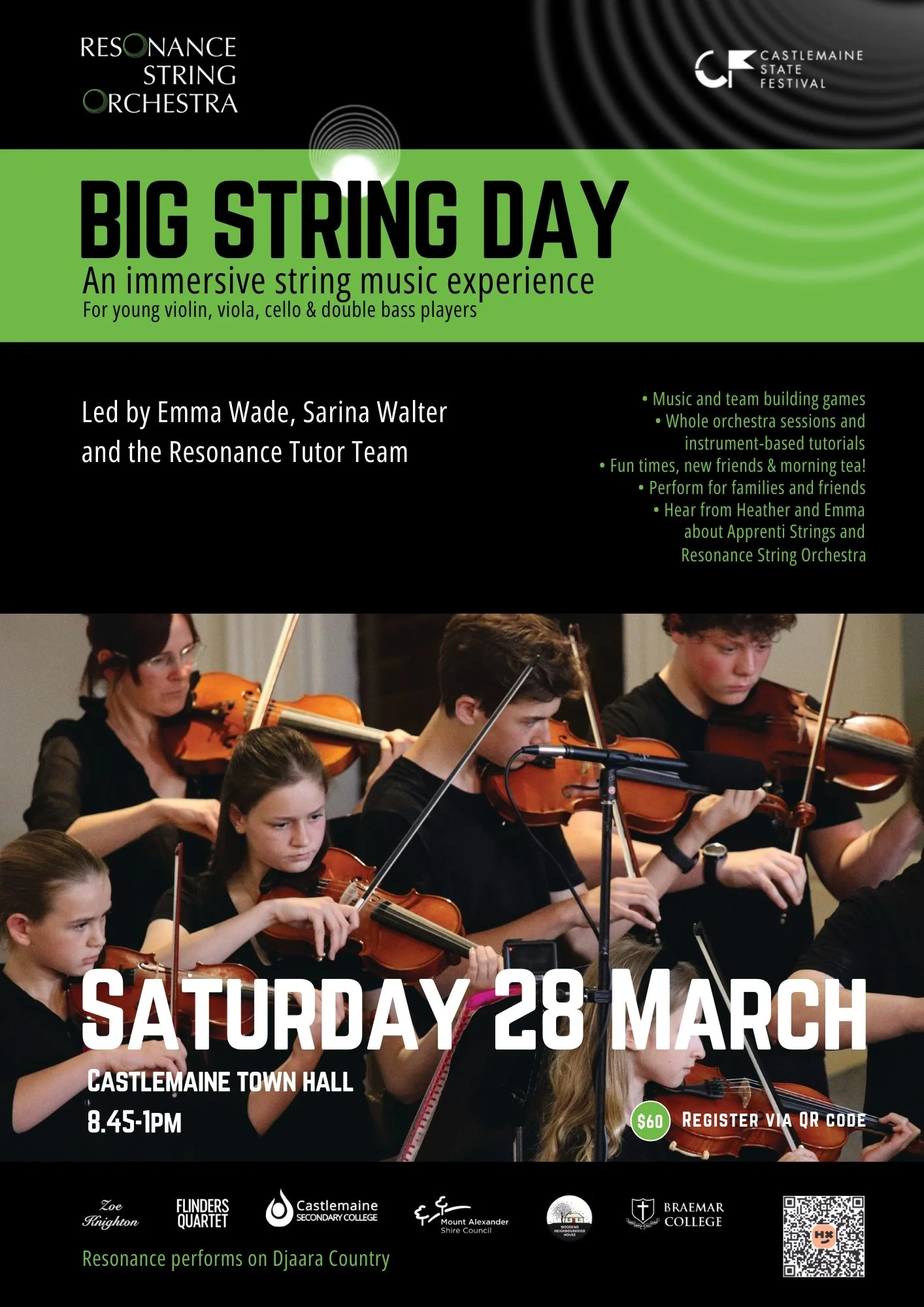 Resonance String Orchestra rehearses weekly in Woodend on Monday evenings, within Victoria’s Macedon Ranges, and fortnightly in Castlemaine on Friday evenings. Tuition is provided by four inspiring professional musicians/educators, with inout from our extraordinary Artistic Patron, the acclaimed Zoe Knighton. Each year, the orchestra presents a major public concert as well as a number of smaller performances and projects.